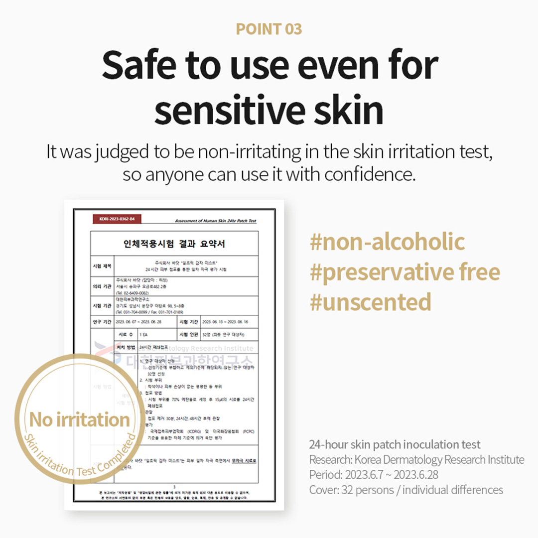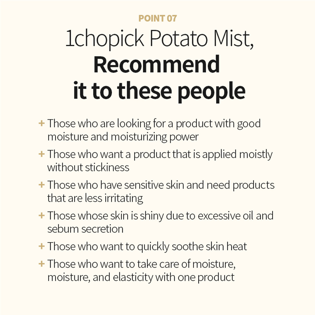 Summary | Hydrating facial mist with 20% Korean potato essence, replenishes moisture and soothes skin. |